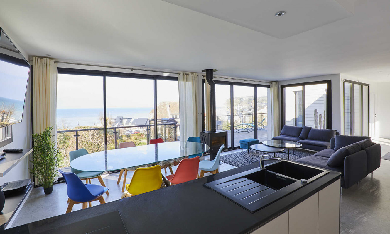 La pièce à vivre de 45 m², baignée de lumière, comprend un salon confortable avec poêle à bois, une grande salle à manger face à la mer, et une cuisine ouverte toute équipée. Le tout s’ouvre sur une terrasse spacieuse de 40 m² aménagée avec salon de jardin, chaises longues et espace détente.