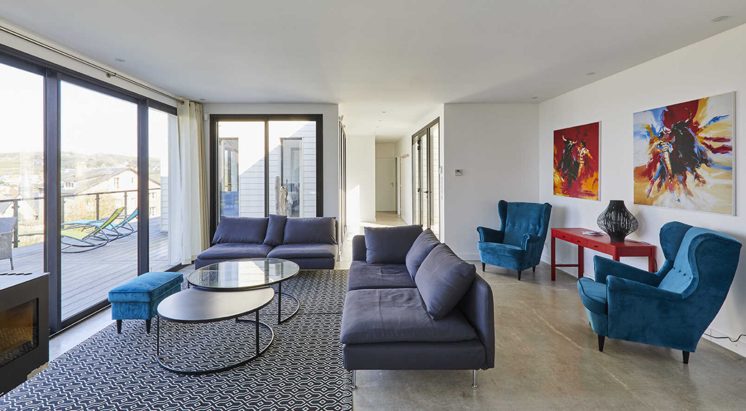 Pensée dans un esprit design et fonctionnel, la villa séduit par ses volumes généreux et sa vue imprenable sur la mer, la plage de Pourville et les falaises emblématiques de la région. Ici, chaque pièce de vie est tournée vers l’horizon.