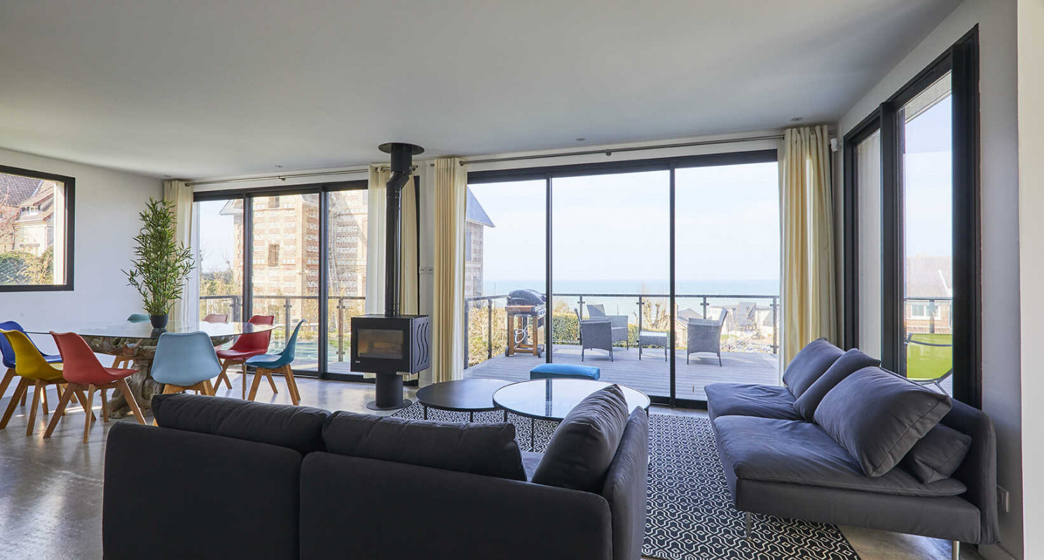 Profitez d’un panorama unique sur la mer, la plage de Pourville et les falaises de la Côte d’Albâtre, depuis le salon, la terrasse et la chambre principale